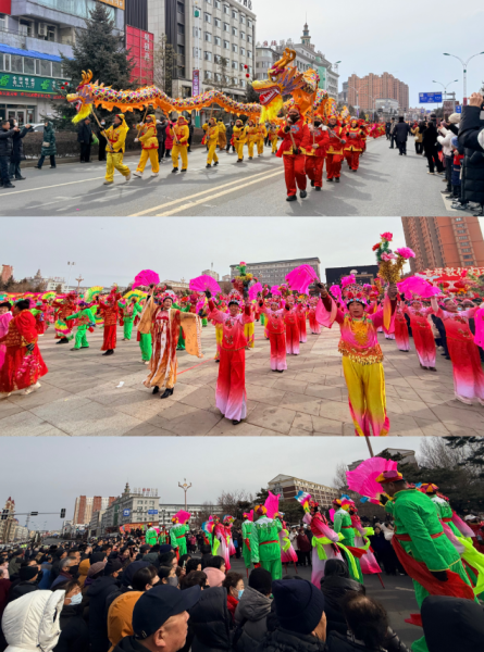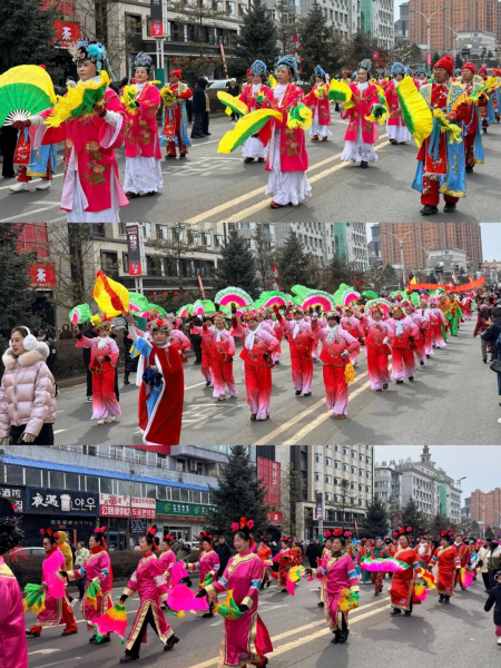 20支秧歌隊(duì)伍從大劇院出發(fā),沿南湖大街至敖東大街與長(zhǎng)白路交匯處行進(jìn)展演,傳統(tǒng)東北大秧歌、滿族秧歌輪番登場(chǎng),踩高蹺、舞龍舞獅……各類非遺絕活悉數(shù)展現(xiàn)。樂(lè)隊(duì)嗩吶與鑼鼓镲交織出快慢錯(cuò)落的傳統(tǒng)曲牌,演員們將秧歌的精髓演繹得淋漓盡致,成為街頭流動(dòng)的風(fēng)景線,隊(duì)伍一路載歌載舞,所到之處歡呼不斷,喜慶氛圍遍布敦城街巷,生動(dòng)展現(xiàn)“吉祥敦化”的和諧盛景。