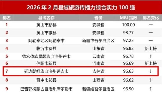 前十!延吉上榜2026年2月縣域旅游傳播力百?gòu)?qiáng)榜單