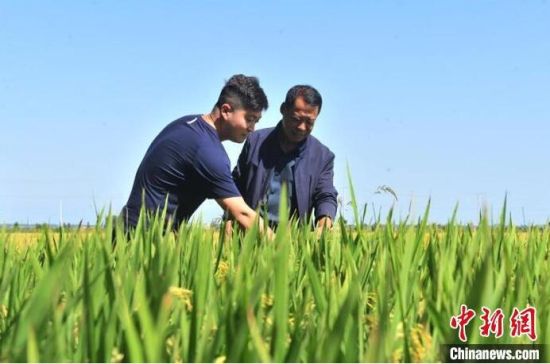 金秋時(shí)節(jié),臺胞林駿睿(左)與吉林農(nóng)民楊萬芳在稻田里觀察水稻。 高龍安 攝