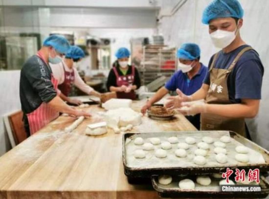 臺(tái)山市臺(tái)城美源餅屋的師傅們?cè)谥谱鬈涳灐@顣源?攝