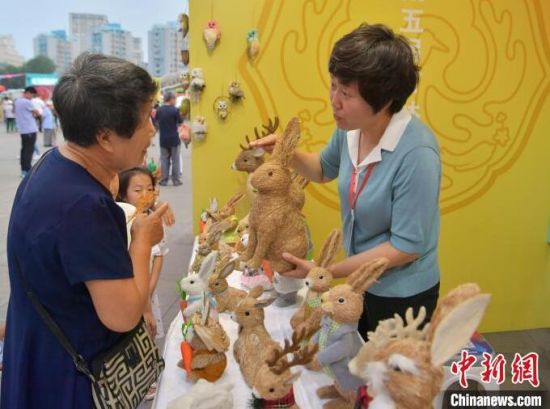 韓氏草編第五代傳承人閆莉(右一)與顧客交流。