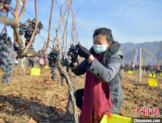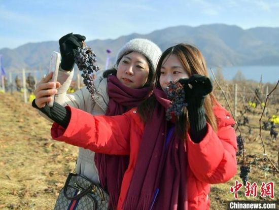 鴨綠江河谷冰葡萄進入最佳采摘時期,游客在采摘冰葡萄。
