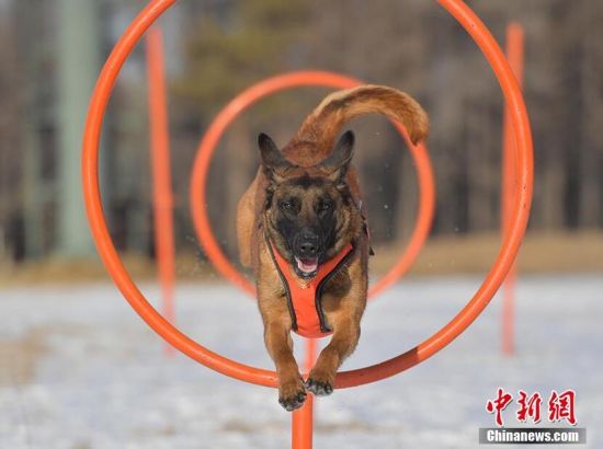 搜救犬正在進(jìn)行跳木圈訓(xùn)練。
