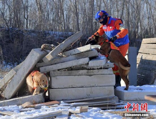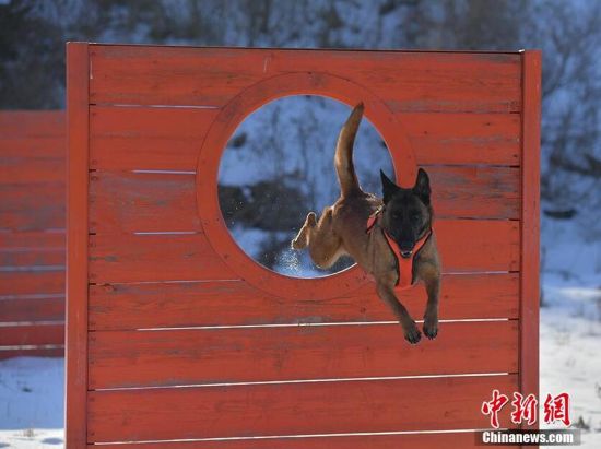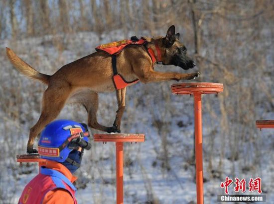 1月18日,在吉林省森林消防總隊(duì)特勤大隊(duì)訓(xùn)練場內(nèi),搜救犬正在訓(xùn)練。為提高搜救犬在嚴(yán)寒環(huán)境的適應(yīng)和實(shí)戰(zhàn)能力,吉林省森林消防總隊(duì)特勤大隊(duì)搜救犬分隊(duì)近期通過障礙攀登、繞腿訓(xùn)練、廢墟搜索訓(xùn)練等科目,對搜救犬進(jìn)行冬訓(xùn),進(jìn)一步提升訓(xùn)導(dǎo)員與搜救犬的默契度和技戰(zhàn)素養(yǎng)。