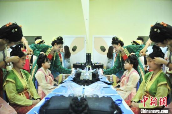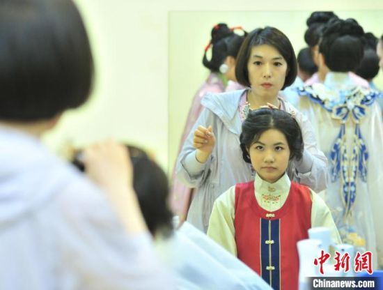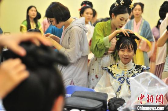 7月9日,吉林四平,2024年全國臺聯(lián)第二十一屆臺胞青年千人夏令營吉林分營的30余位臺胞青年參加傳統(tǒng)文化講座,學(xué)習(xí)漢服禮儀、漢服種類劃分等知識,并第一次穿上漢服進(jìn)行體驗(yàn),感受傳統(tǒng)文化之美。圖為臺胞青年在進(jìn)行漢服妝造。高龍安 攝
