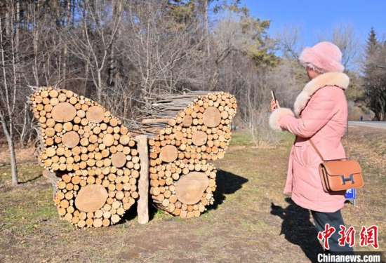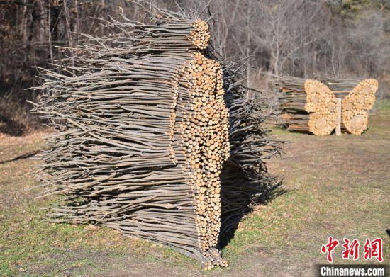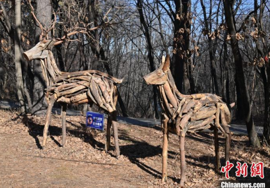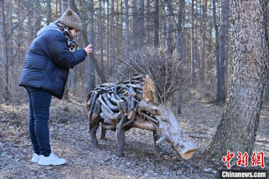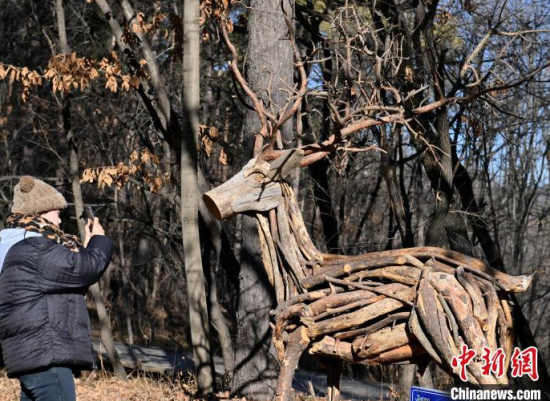 11月18日,在位于吉林長春的凈月潭國家級風(fēng)景名勝區(qū)內(nèi),游客在參觀雕塑。凈月潭國家級風(fēng)景名勝區(qū)的工作人員利用一個月的時間,用掉落的枯枝制作成多處雕塑,成為冬日一景。中新社記者 張瑤 攝