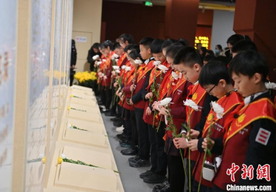 12月13日,在位于吉林長(zhǎng)春的東北淪陷史陳列館,民眾在向英烈名錄獻(xiàn)花。當(dāng)天,偽滿皇宮博物院暨東北淪陷史陳列館聯(lián)合社會(huì)各界人士,共同舉辦“千秋忠烈 百世遺芳”南京大屠殺死難者國(guó)家公祭日悼念活動(dòng),沉痛悼念南京大屠殺死難同胞以及在抗日戰(zhàn)爭(zhēng)中獻(xiàn)出生命的革命英烈。中新社記者 張瑤 攝