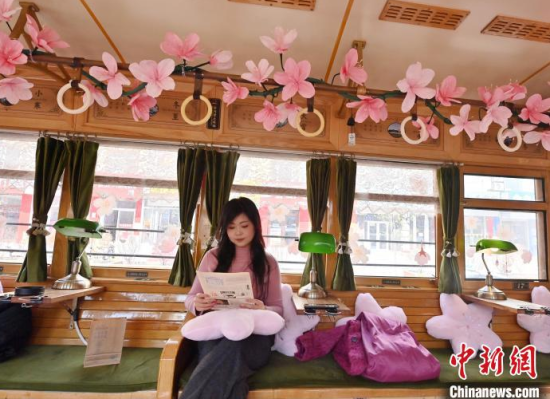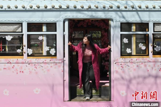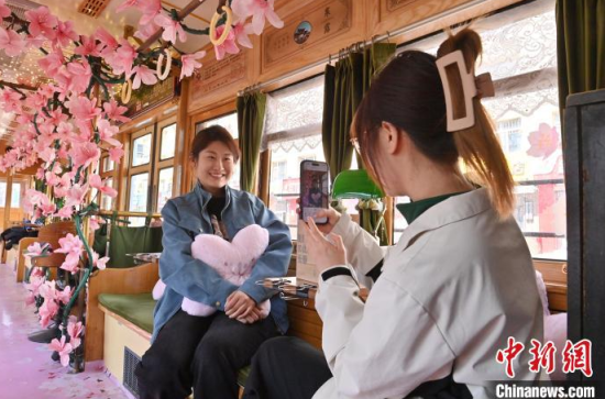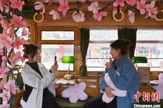 4月18日,吉林長春,游客在54路文旅春日限定專列上拍照留念。該專列車廂內(nèi)外融入了桃花的設(shè)計元素,營造出濃郁的春意,吸引了眾多游客前來打卡。中新社記者 張瑤 攝