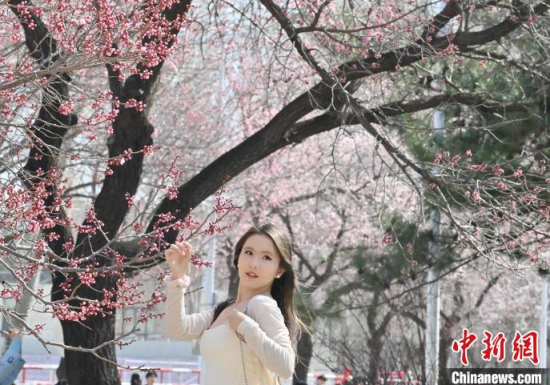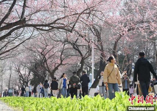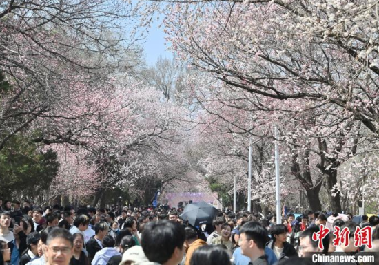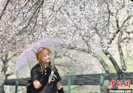 4月20日,吉林長春,吉林大學校園內杏花競相綻放,匯成粉白色的海洋,吸引市民前來賞花、拍照。 中新社記者 張瑤 攝