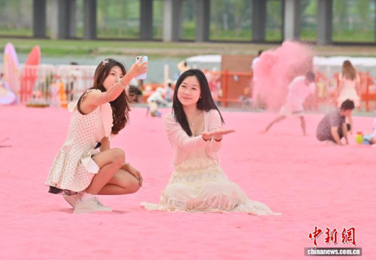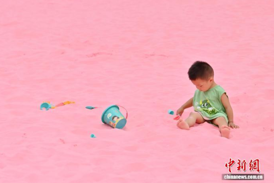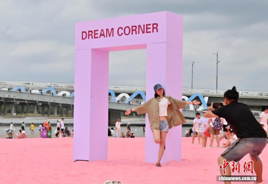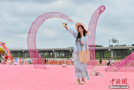 7月24日,長春市一處人工打造的粉沙灘吸引眾多游客前來打卡。這片沙灘呈現(xiàn)出夢幻的粉色,搭配周邊綠植和休閑設(shè)施,營造出浪漫氛圍。中新社記者 張瑤 攝