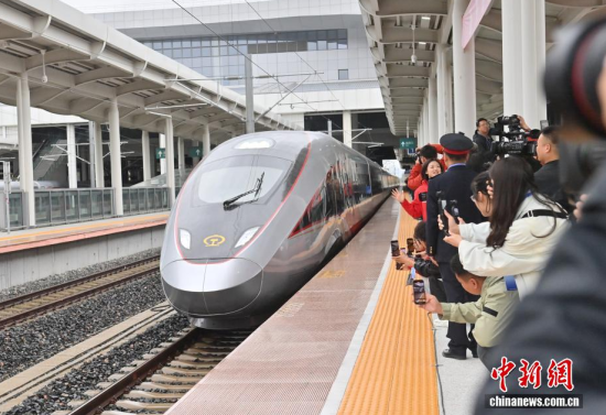 9月28日,G8166次列車從長(zhǎng)白山站始發(fā),駛向終點(diǎn)站沈陽(yáng)北站,沈白高鐵正式開(kāi)通運(yùn)營(yíng),結(jié)束了吉林省通化、白山兩市不通高鐵的歷史,北京朝陽(yáng)站、沈陽(yáng)北站至長(zhǎng)白山站的最短旅行時(shí)間分別為4小時(shí)33分、1小時(shí)53分。作為中國(guó)東北高鐵網(wǎng)重要組成部分,該線路對(duì)暢通區(qū)域經(jīng)濟(jì)循環(huán)、促進(jìn)沿線旅游資源開(kāi)發(fā)等具有重要作用。中新社記者 張瑤 攝