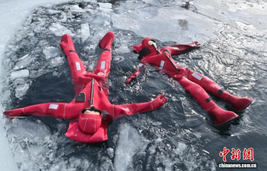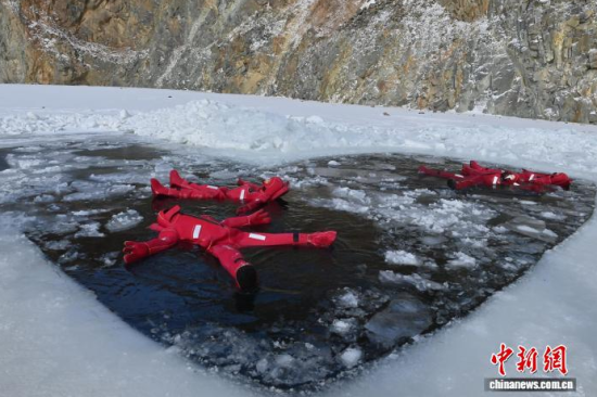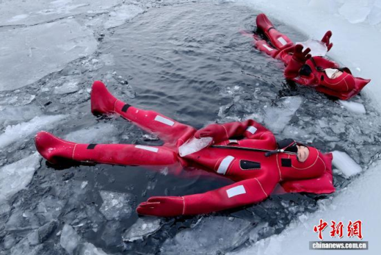 2月5日,吉林省長春市,一項獨特的冰浮項目吸引眾多游客前來體驗。在嚴寒天氣中,參與者身穿醒目的紅色浮力裝備,悠然漂浮于冰面之上,感受別致的冰雪樂趣。圖為游客在下水前拍照留念。中新社記者 張瑤 攝