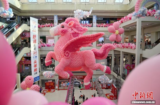 2月11日,吉林長春一商場內(nèi)懸掛用8萬個氣球組成的“瑞馬迎春”裝置,迎接丙午馬年春節(jié)。中新社記者 張瑤 攝