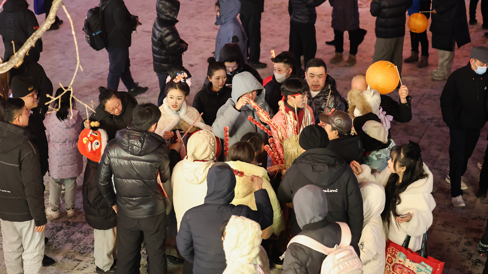 市民陳桂英是第三次走進(jìn)這片街區(qū)。74歲的她挎著相機(jī),拍下了舞龍隊(duì)伍、漢服巡游、冰雕糖葫蘆,也拍下了四海茶社門(mén)前被雪花浸白的樹(shù)枝,和游人歡樂(lè)說(shuō)笑的身影。